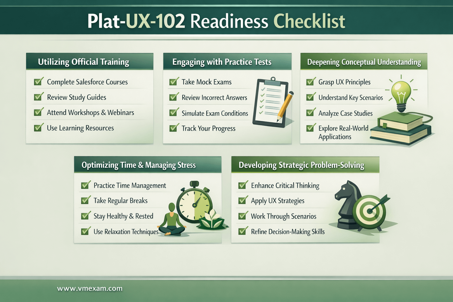 To genuinely assess one's readiness and accurately pinpoint specific areas requiring further improvement, incorporating a high-quality Salesforce Platform Strategy Designer practice exam into your regular study routine is not just beneficial, but absolutely essential. Practice tests adeptly simulate the actual exam environment, thereby helping candidates become intimately familiar with the exact question formats, the nuanced language used, and the critical time constraints. Concurrently, a comprehensive Plat-UX-102 study guide can effectively condense vast amounts of complex information into manageable, digestible segments, meticulously focusing on the most pivotal concepts and recurring themes. For a truly reliable and authentic practice experience that mirrors the real exam, it is highly advisable to explore the premium preparation options available, such as those found at VMExam's Plat-UX-102 preparation materials, which are designed to enhance your readiness.
